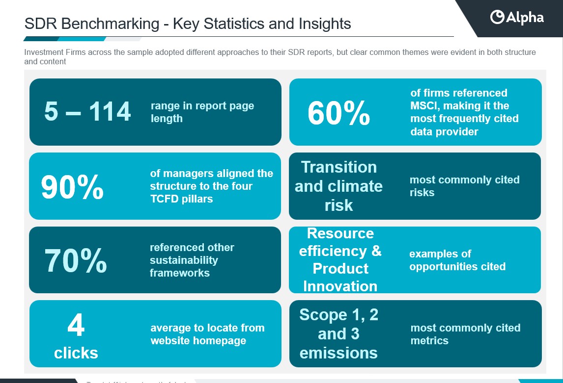 Our analysis highlights emerging trends in how firms are approaching both the structure and content of their reports, and distils key takeaways to help teams strengthen their own SDR reporting. Strong narrative, cohesion across sustainability disclosures, and a clear focus on materiality emerged as critical elements of effective reporting.